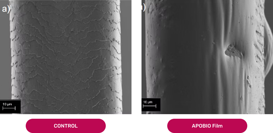 The active ingredient adheres to the hair fiber, forming a protective film, as observed in SEM-FEG images.